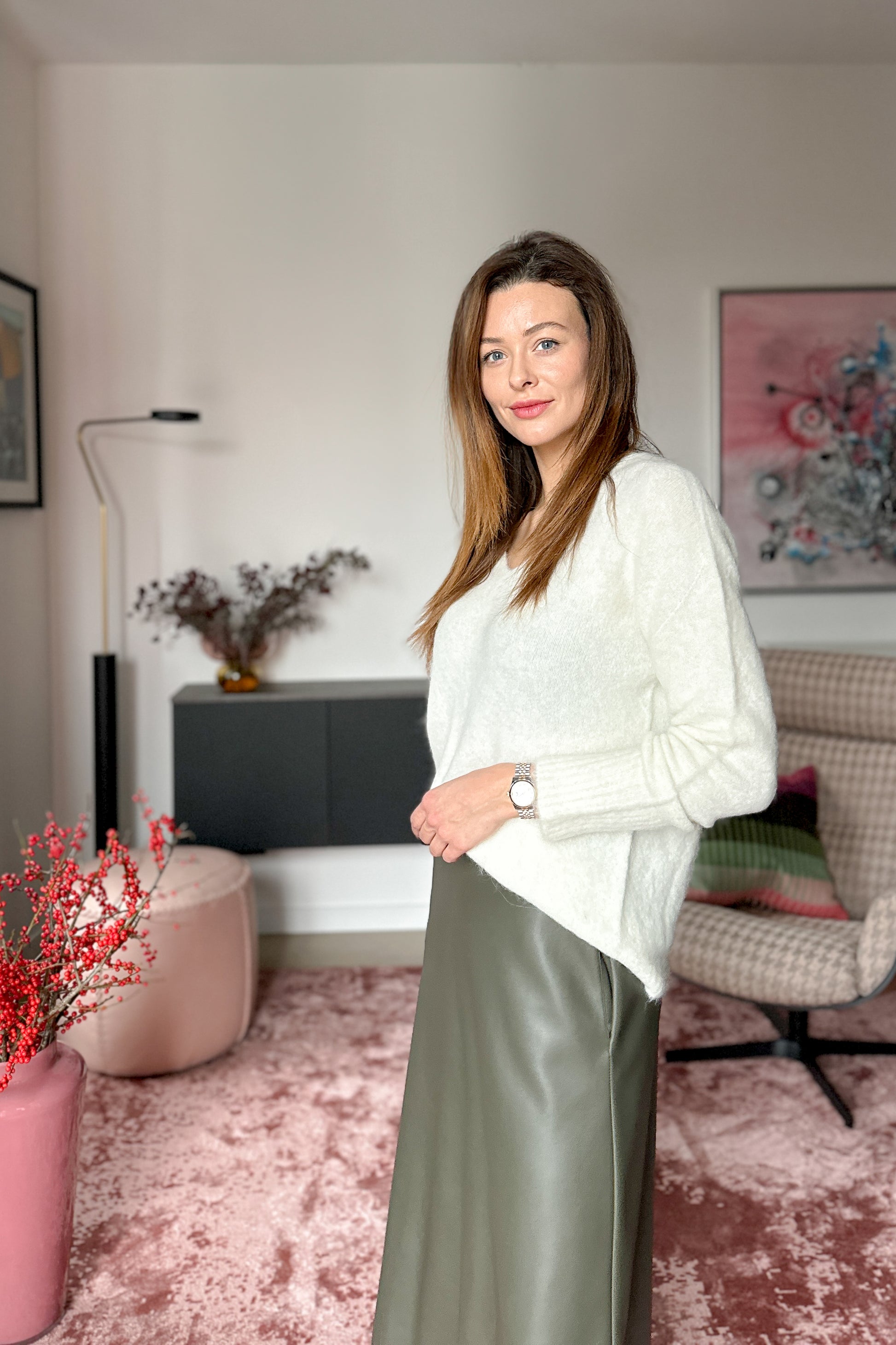 Ez a letisztult, V-nyakú pulóver a minimalista elegancia és a kényelem tökéletes találkozása. Puha anyaga, mely alpaka gyapjút is tartalmaz, extra melegséget és luxus érzetet biztosít.